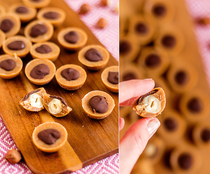 - Masę przelewamy do foremki, do każdego zagłębienia wkładamy po jednym orzechu laskowym, odstawiamy do przestudzenia następnie foremkę umieszczamy w zamrażarce na ok. 5 minut
